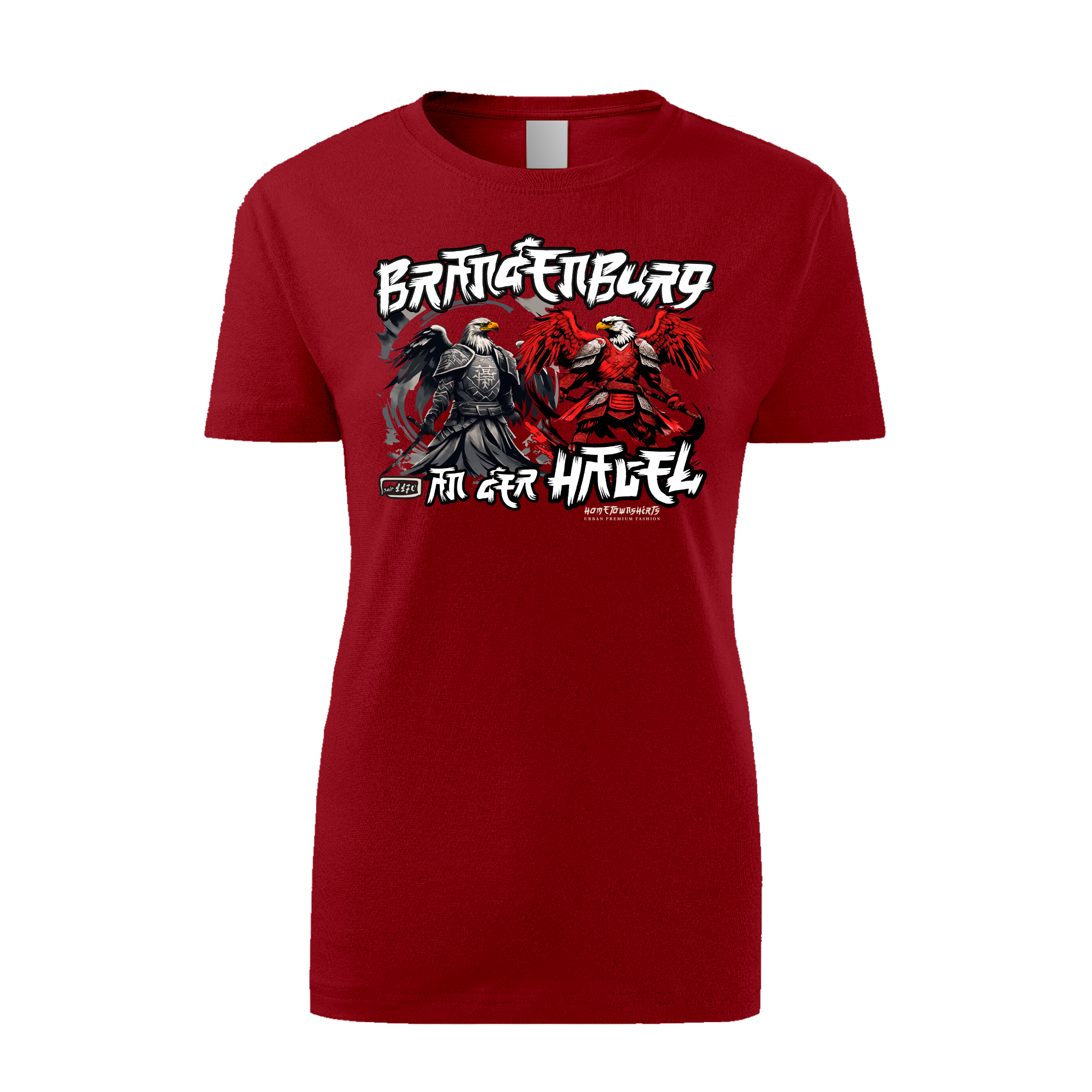 Das markante Motiv – zwei kämpferische Adler in Samurai-Rüstung, einer in Schwarz, einer in Rot – steht für Kraft, Dualität und die historische Bedeutung der Stadt. Der dynamische Schriftzug „Brandenburg an der Havel“ im urbanen Graffiti-Stil vereint Tradition und Gegenwart zu einem einzigartigen Design.
