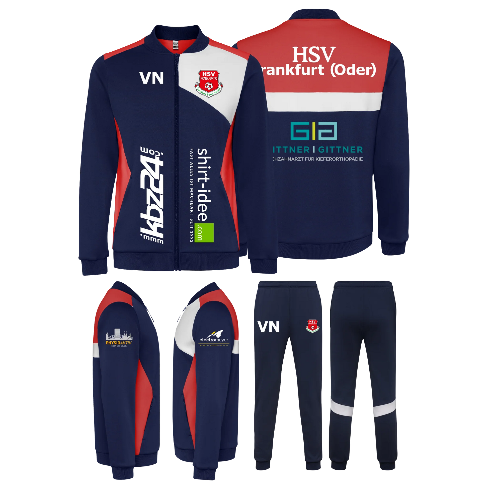 Trainingsanzug mit Sponsorenplatzierung auf Ärmeln, Brust und Rücken. Die sichtbaren Logos würdigen die Unterstützer des HSV Frankfurt (Oder) und symbolisieren die starke Partnerschaft für den Handballsport in der Region.