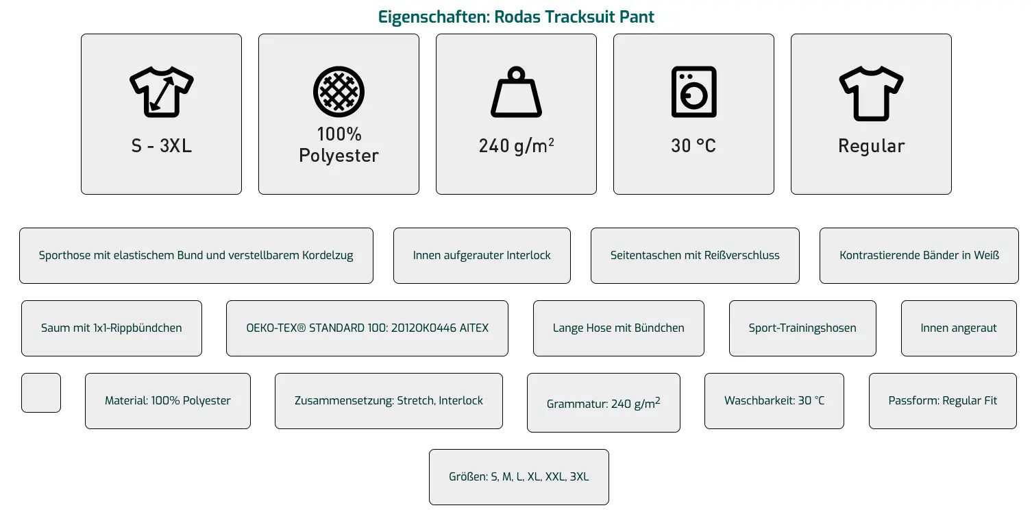 100% Polyester-Interlock mit Stretch-Eigenschaften und 250 g/m² Grammatur sorgt bei Jacke und Hose für Wärme, Formstabilität und Bewegungsfreiheit. Die innen aufgeraute Verarbeitung bietet ein weiches Gefühl auf der Haut, während die veganen Materialien nach OEKO-TEX® STANDARD 100 (2012OK0446 AITEX) für Sicherheit und Nachhaltigkeit stehen.