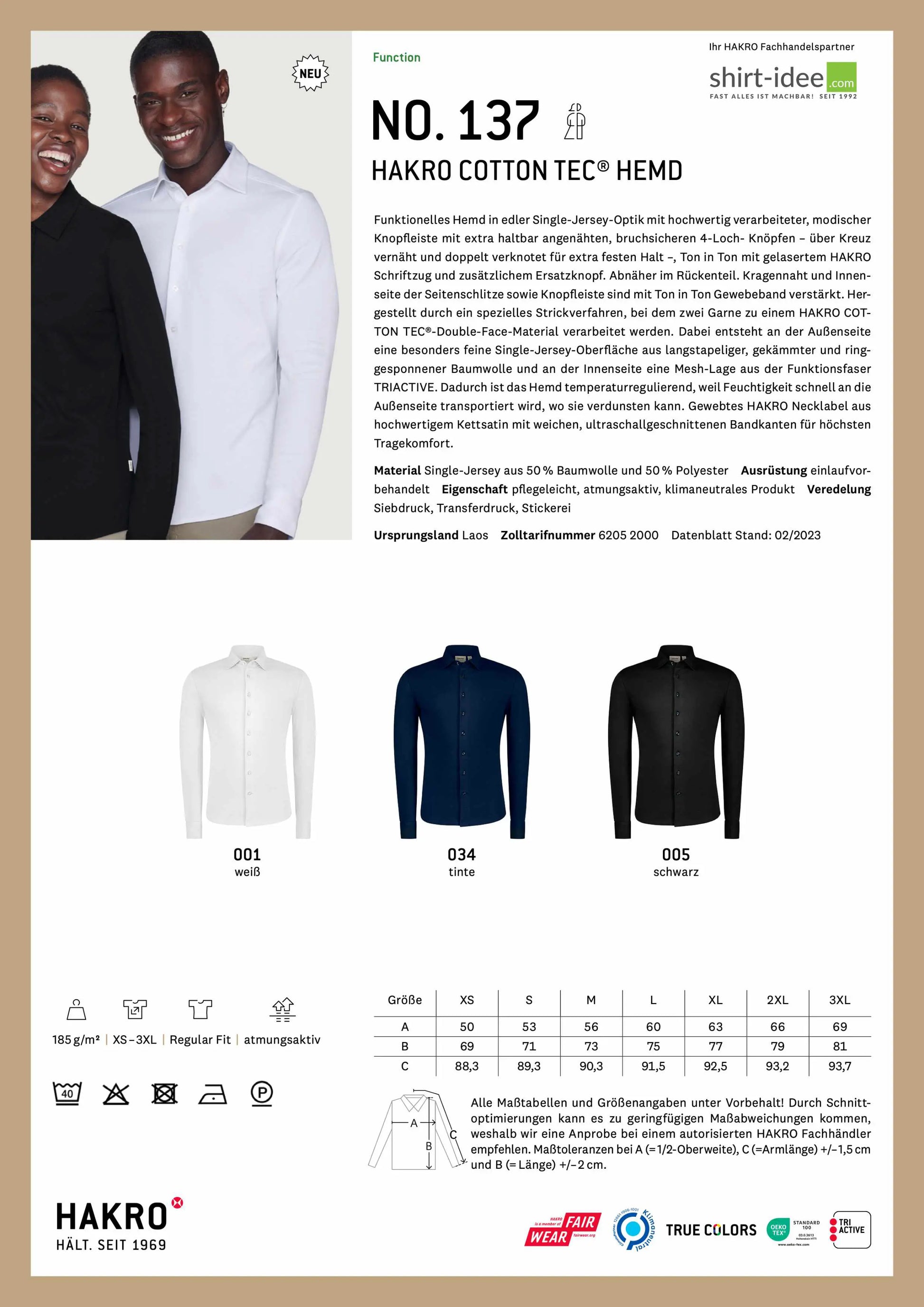 Basis des Hemdes ist ein unisex-fähiges, funktionelles Hemd aus Double-Face-Maschenware HAKRO COTTON TEC®, das speziell für hohen Tragekomfort und Performance im Alltag entwickelt wurde. Die Außenseite besteht aus feinem Baumwoll-Single-Jersey, während die Innenseite aus einem Polyester-Mesh aus der Funktionsfaser TRIACTIVE gefertigt ist. Diese Materialkombination (60% Baumwolle, 40% Polyester) sorgt dafür, dass Feuchtigkeit schnell von der Haut weg nach außen transportiert wird, wo sie verdunstet – so bleibt das Hemd atmungsaktiv und unterstützt ein angenehmes Körperklima, selbst bei Bewegung oder höheren Temperaturen.