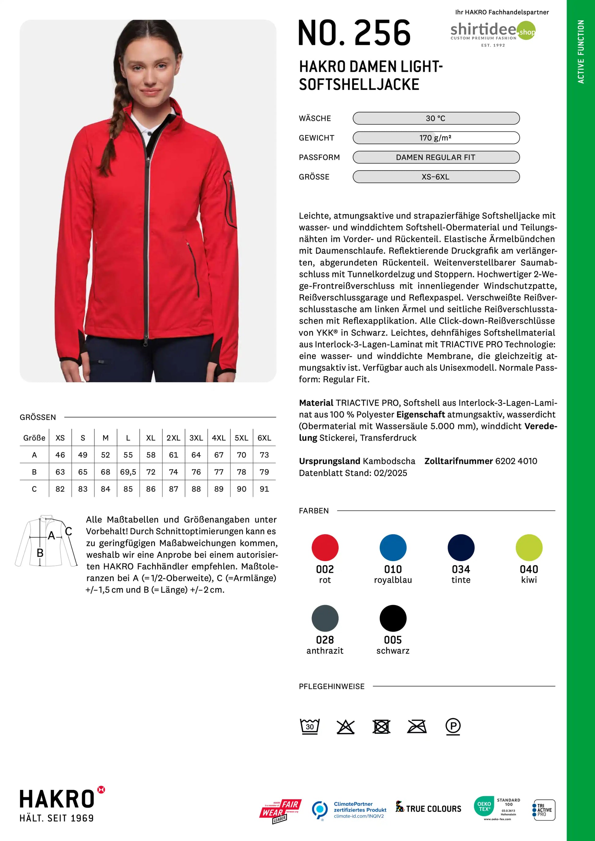 - Damen Light-Softshell-Jacke mit Regular-Fit-Schnitt (XS–6XL), leichtem 170 g/m²-Material und femininer Linienführung.