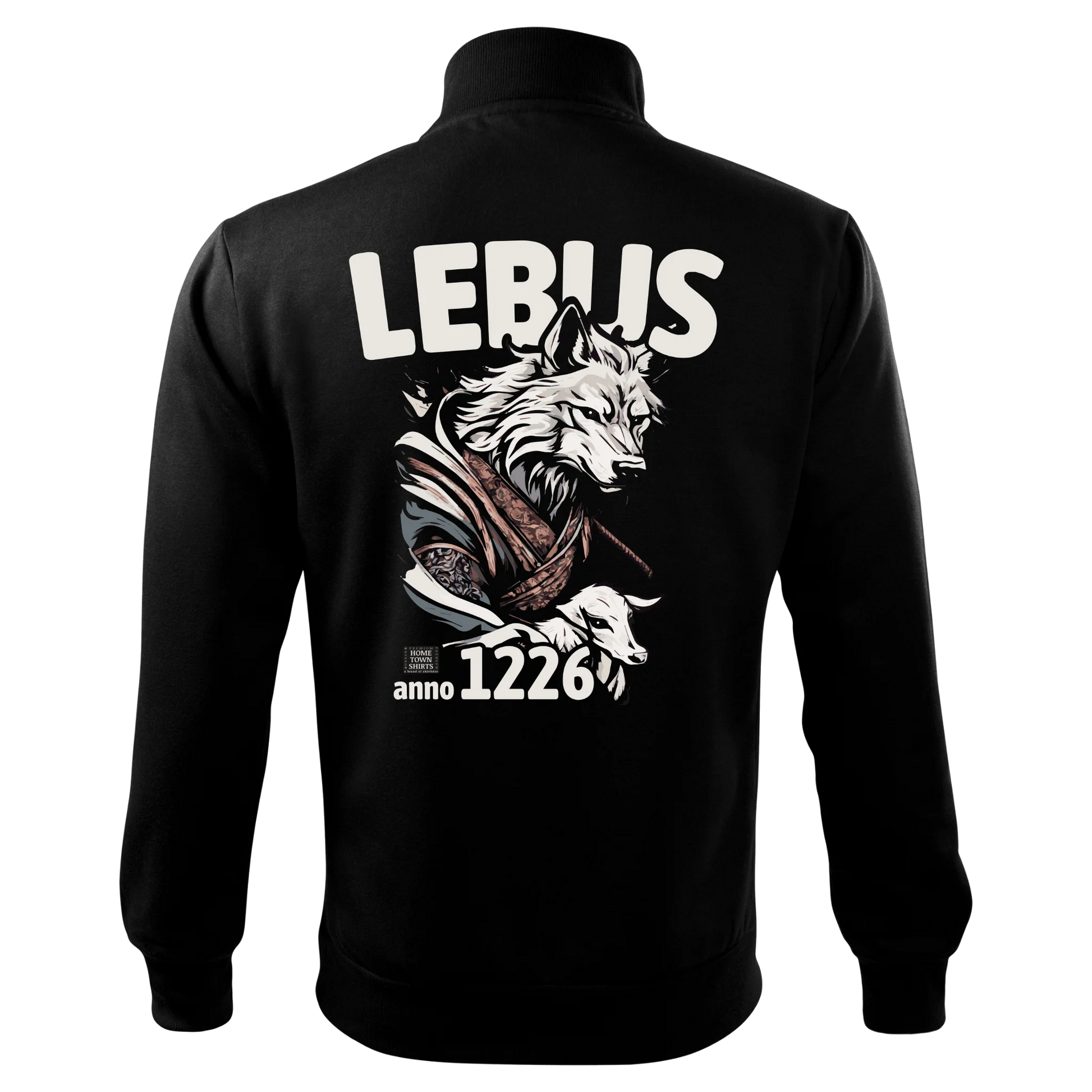 Auf dem Rücken dominiert der große Wolf, detailreich illustriert und von dynamischen Linien umgeben, wodurch die Jacke schon von weitem ins Auge fällt. Auf der Vorderseite sorgt ein kleineres Logo mit Wolf, Schaf und dem Schriftzug „anno 1226“ für einen dezenten, aber klar erkennbaren Bezug zu Lebus – ideal für Alltag, Freizeit oder lokale Events.