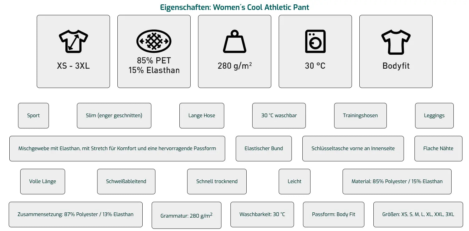Die Leggings ist slim geschnitten (enger Fit) und als lange Hose konzipiert, wodurch sie die Beine optimal unterstützt. Sie ist in den Größen XS bis 3XL erhältlich und somit für viele Körperformen geeignet. Die Pflege ist unkompliziert, da sie bei 30 °C waschbar ist – ideal für den regelmäßigen Einsatz im Sport.