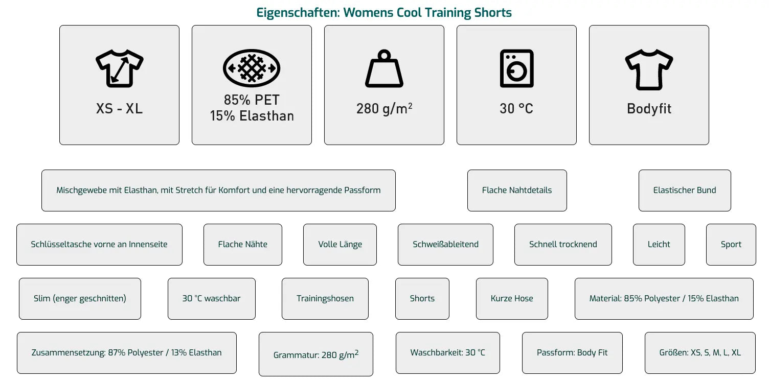 Die Shorts ist slim geschnitten (enger Fit) und in den Größen XS bis XL erhältlich und somit für viele Körperformen geeignet. Die Pflege ist unkompliziert, da sie bei 30 °C waschbar ist – ideal für den regelmäßigen Einsatz im Sport.